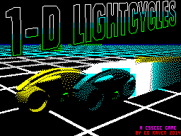 Apparently this entry was supposed to be knocked up in a night and started off life as "1-D Lightcycles," however, author "Ed" (or Nick from work as I know him) wasn't happy that the two UDGs just collided with each other in the middle of the screen thus delivering "the joke" and ending the game. Luckily for me - because that would have been a short review - all that remains of "1-D Lightcycles" is the SCREEN$ as Ed decided to re-work the game (and the title/loader) into something a little more playable instead. The subtly named; "Sh*te Cycles" was conceived.
