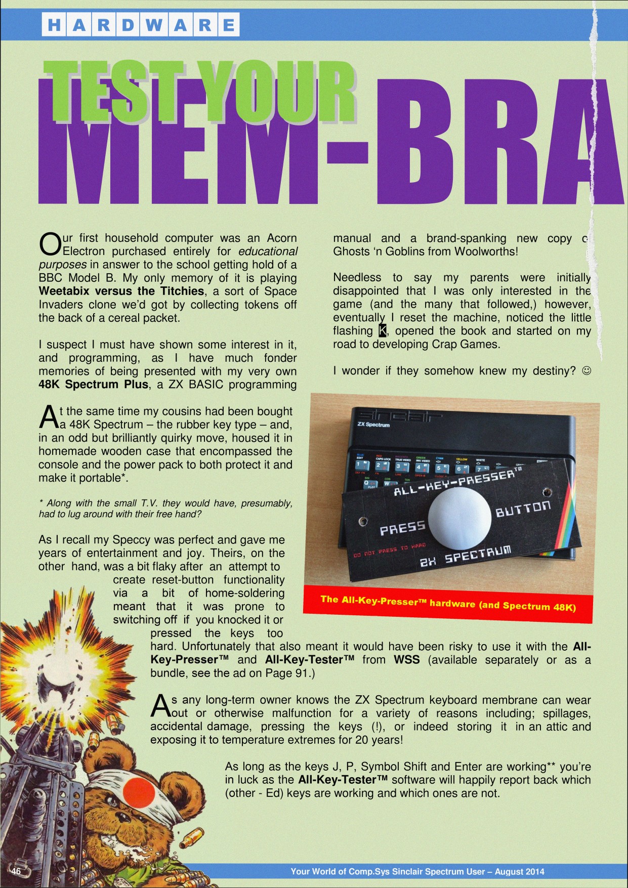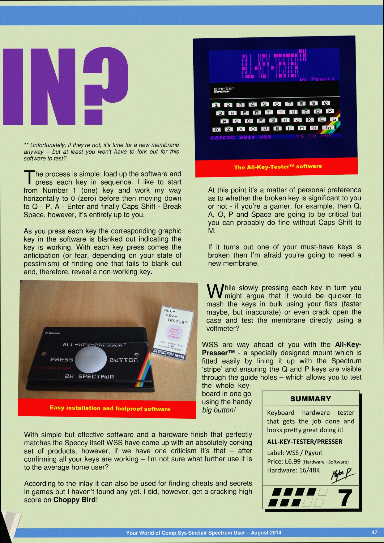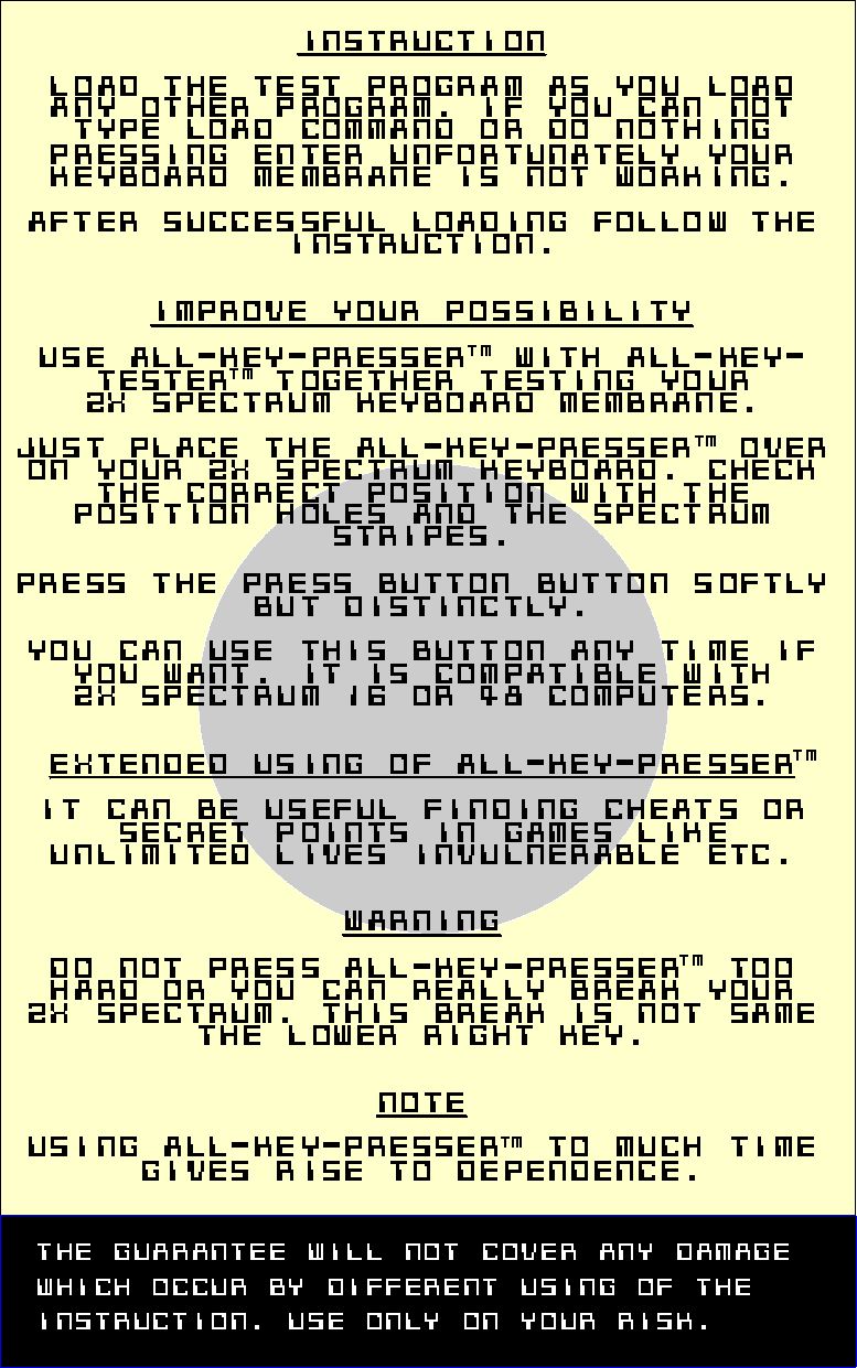 Apparently there's also a bit of hardware that goes with this - The All-Key-Presser - but I couldn't tell you a thing about it as, save a couple of tantalising .jpeg photos, it looks like ours got lost in the post? I'd also love to tell you how Pgyuri's software works, however, he's implemented some kind of security mechanism into the supposedly BASIC program that I was unable to crack. With so little to go on I'm going to leave this review there but, if you're interested, here's what one of the more popular Speccy mags had to say about it: